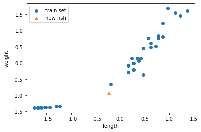 - 생선의 길이와 무게의 값이 놓인 범위가 매우 다르기 때문에 두 특성의 스케일을 조정해야함