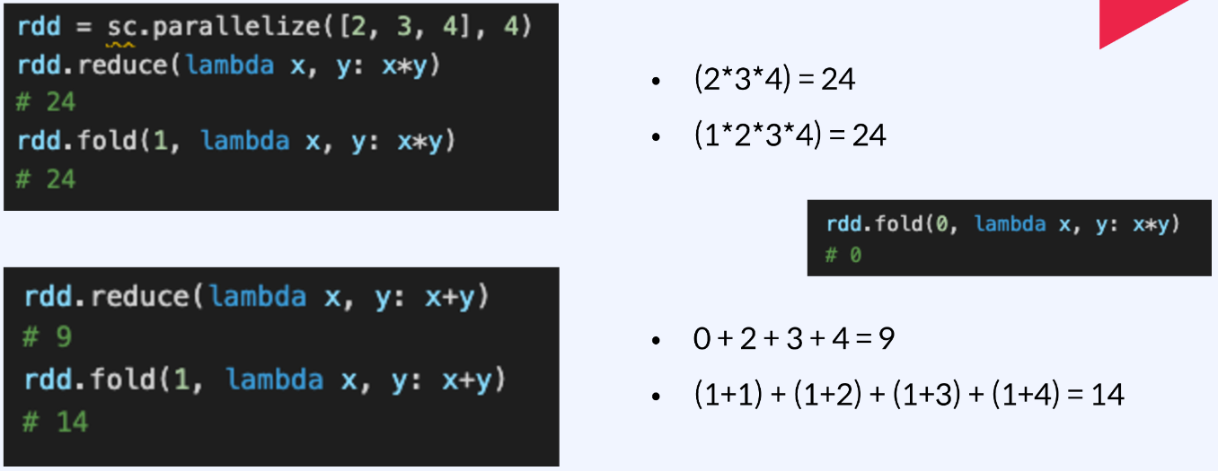 sc.parallelize([1, 2, 3, 4, 5]).fold(0, add) # 15