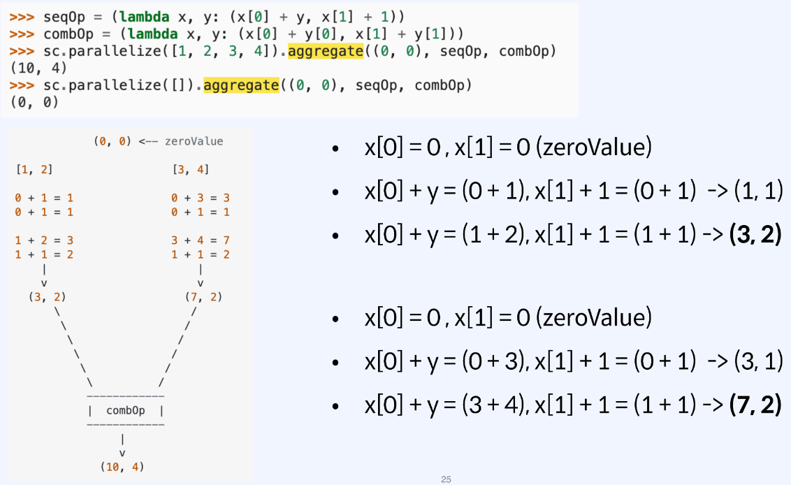 - RDD.aggregate(zeroValue, seqOp, combOp)