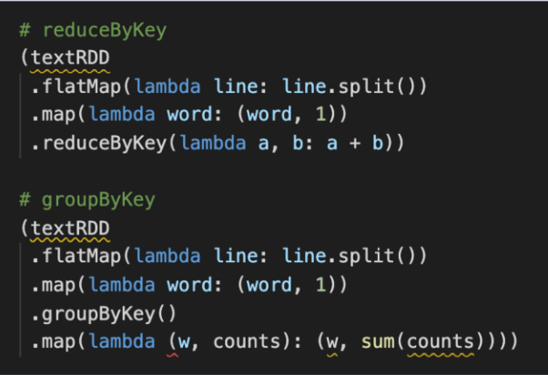 - 따라서, 미리 reduce를 하여 통신이 일어나는 횟수를 줄이도록 하는 함수인 reducebykey를 사용하는 것이 좋다.